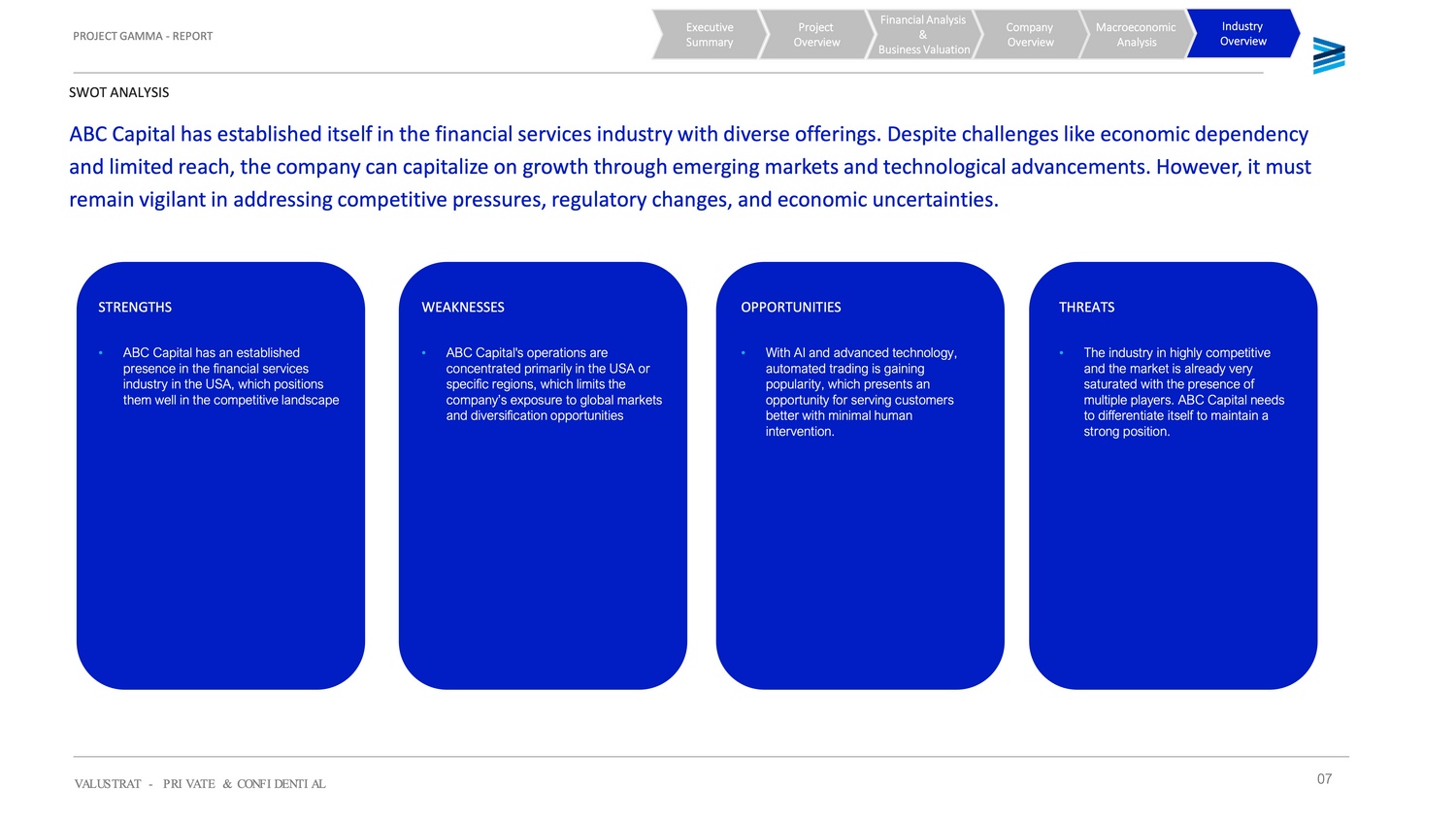 Our valuation reports provide a complete business perspective, including your market landscape, competitive position, and growth outlook. Each report is tailored to your business so that you can use it for investment analysis, fundraising, mergers and acquisitions, financial reporting and investor presentations.