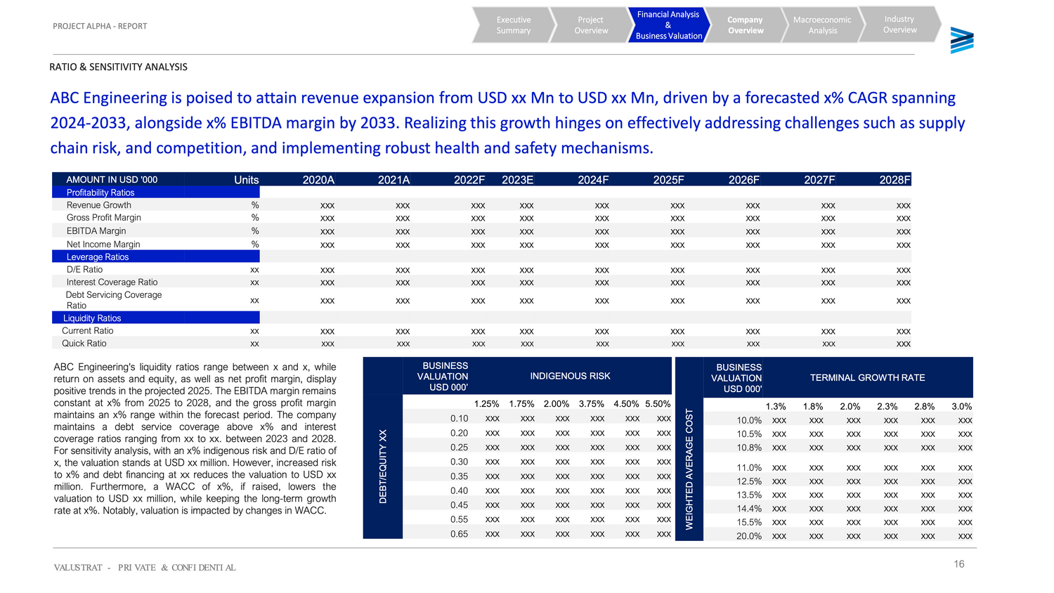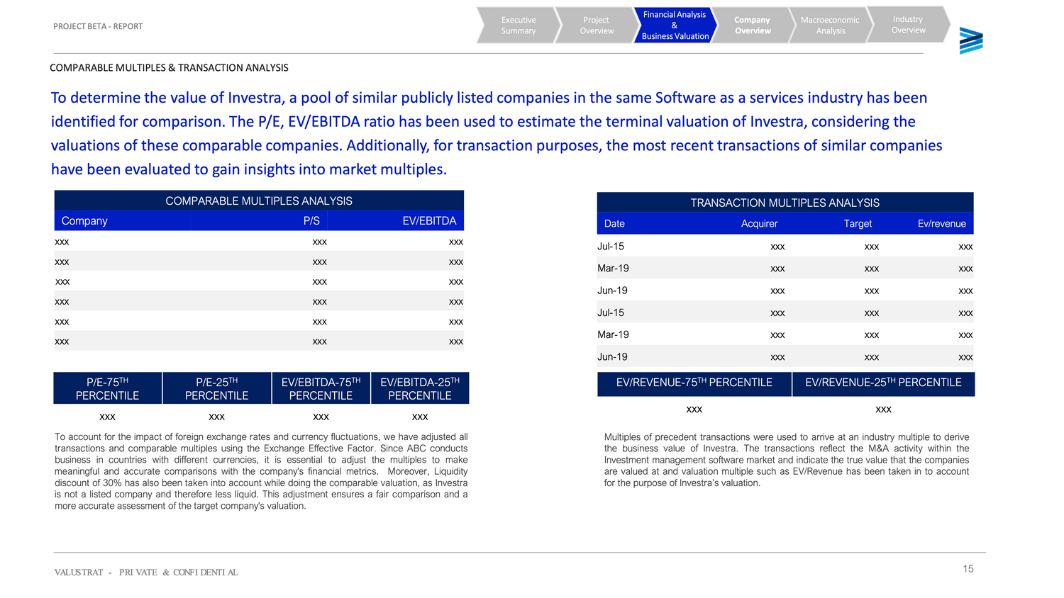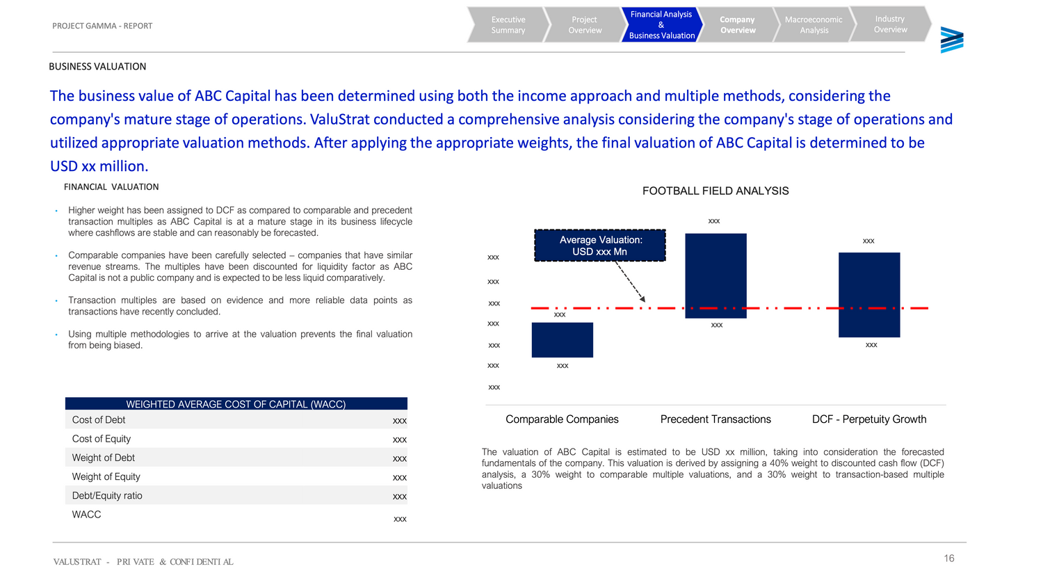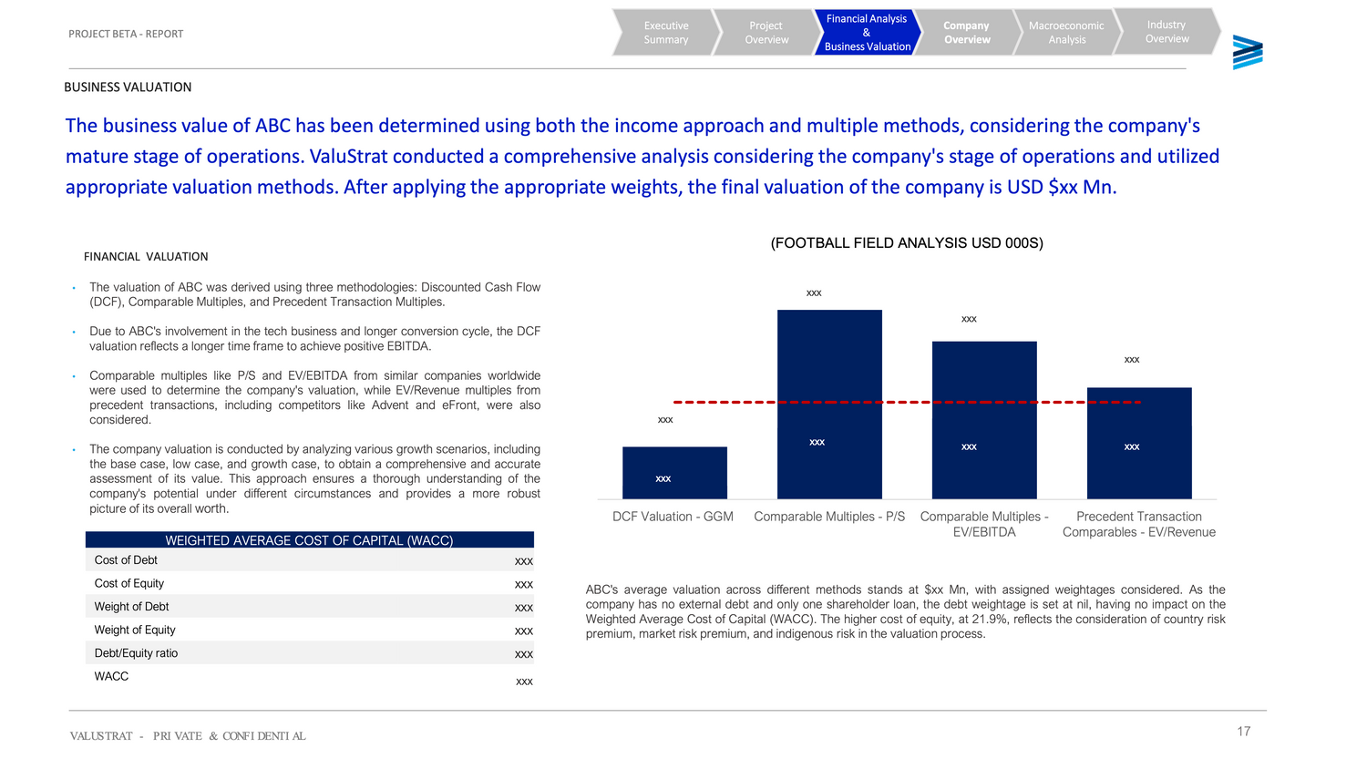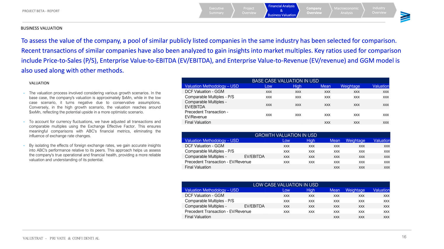 Within the business valuation section, we will employ established methodologies such as DCF (Discounted Cash Flow), comparable company analysis, and precedent transactions, meticulously tailored to the company's specifics. This will result in a presentation of valuation ranges, supported by visually presented sensitivity analyses, comprehensive ratio assessments, and insights into underlying growth assumptions.
