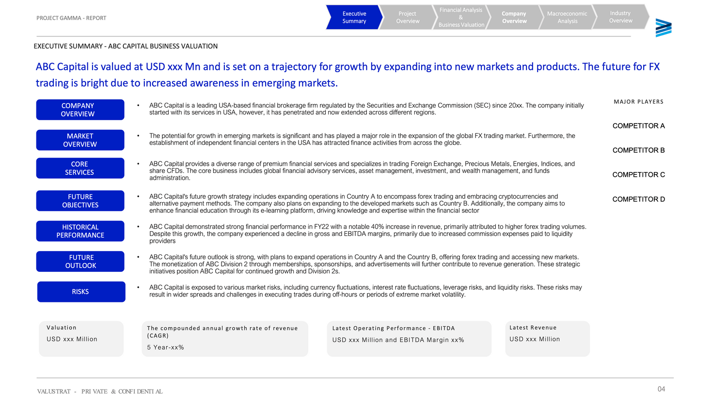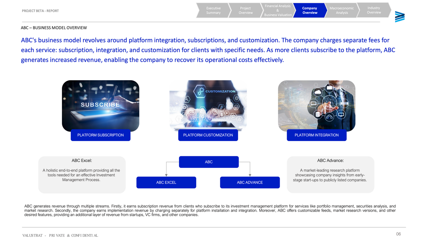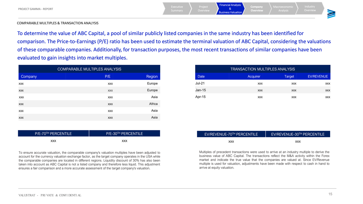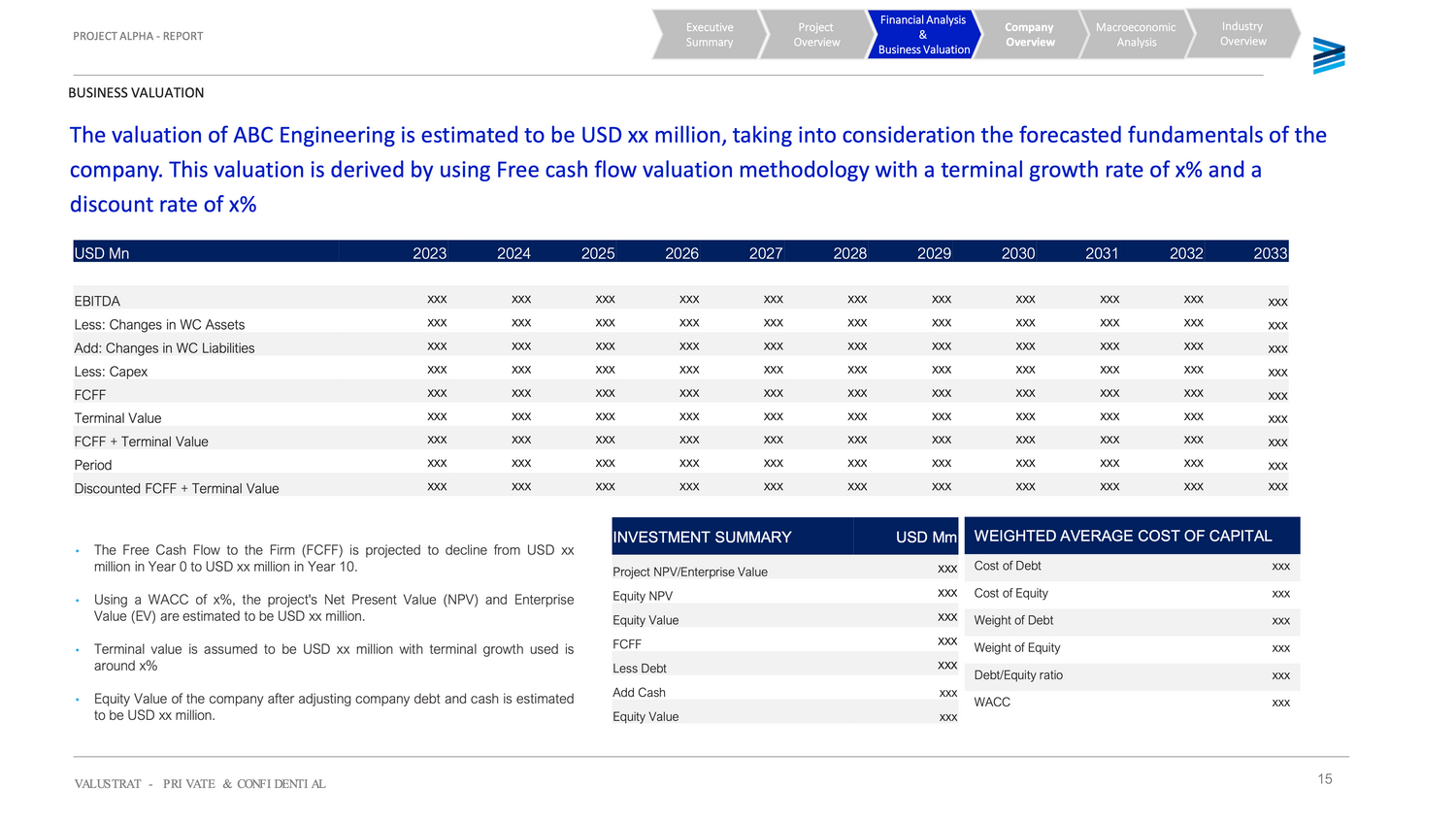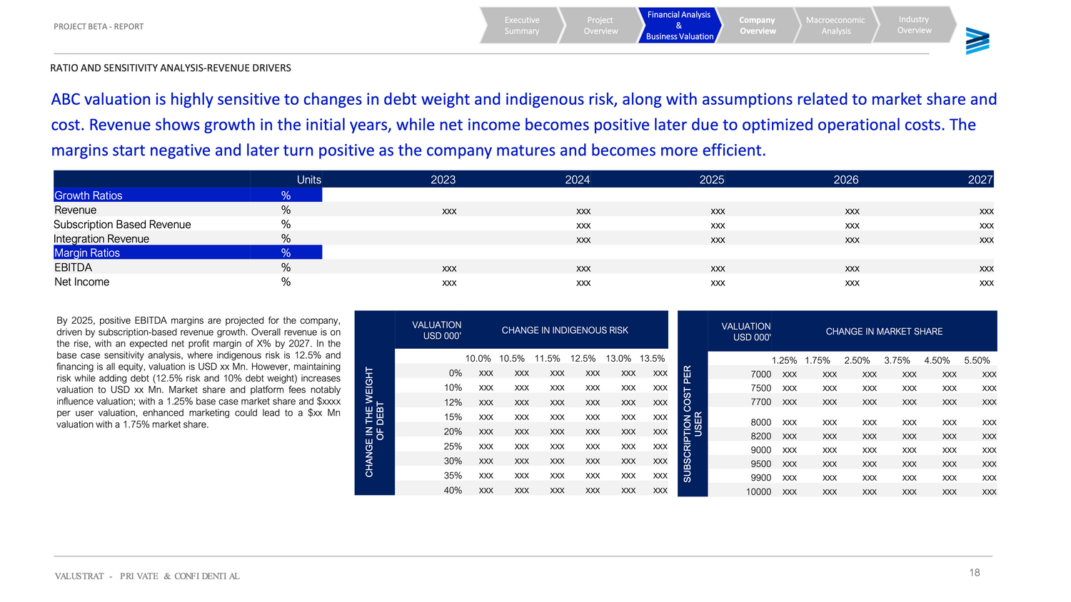 Within the business valuation section, we will employ established methodologies such as DCF (Discounted Cash Flow), comparable company analysis, and precedent transactions, meticulously tailored to the company's specifics. This will result in a presentation of valuation ranges, supported by visually presented sensitivity analyses, comprehensive ratio assessments, and insights into underlying growth assumptions.