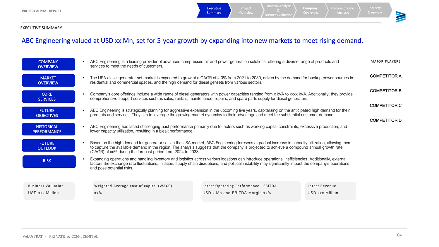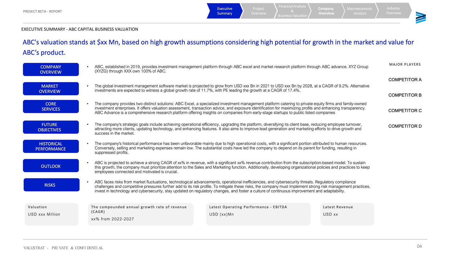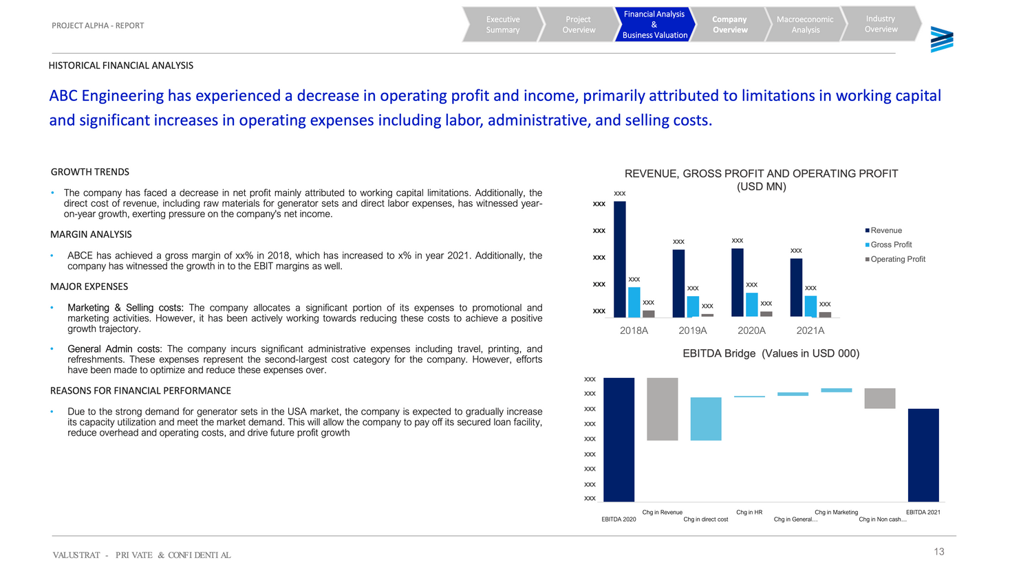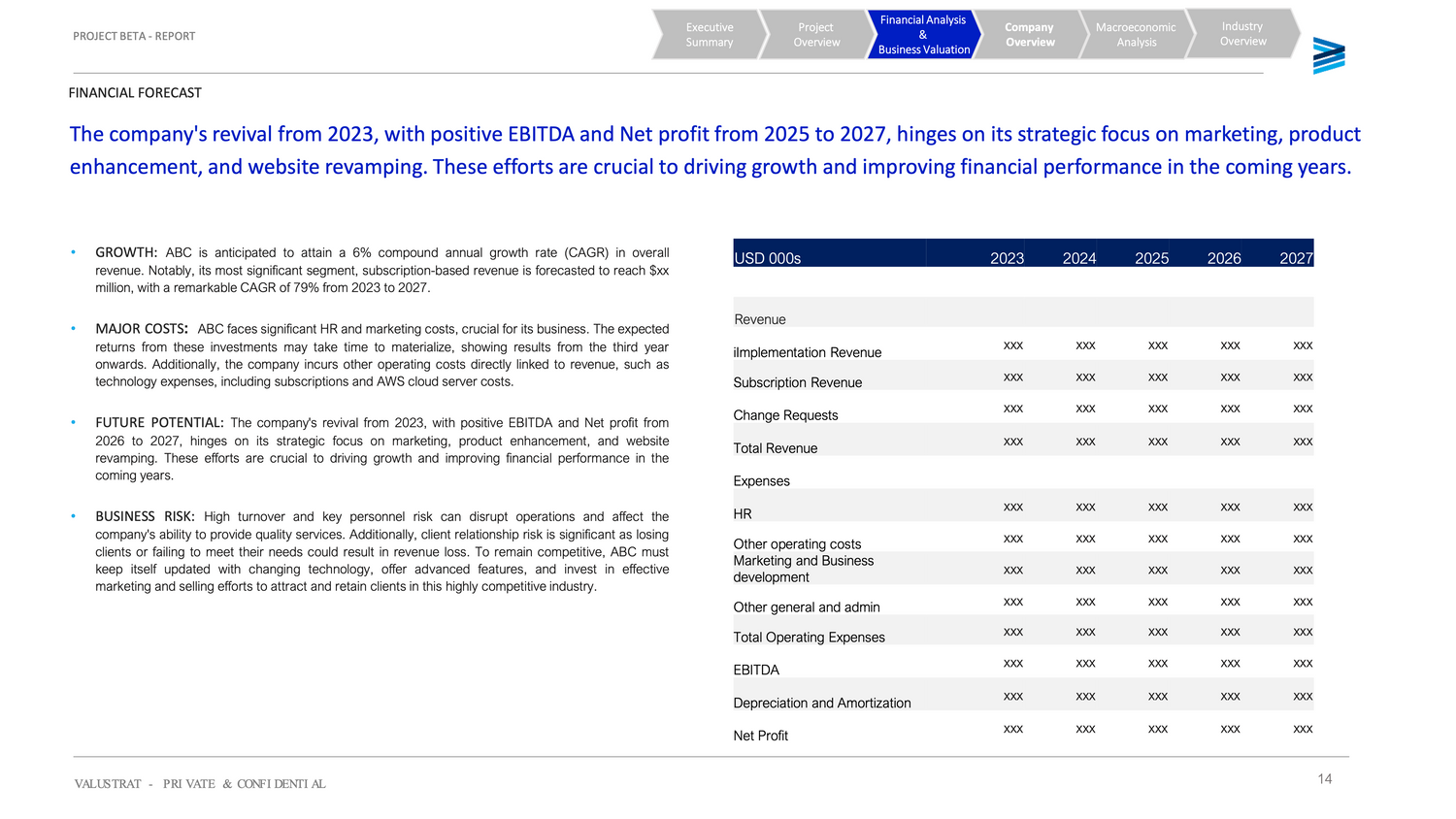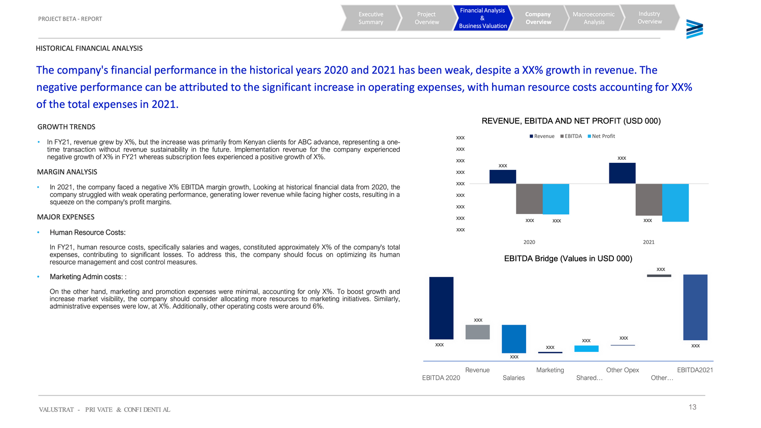 Within the business valuation section, we will employ established methodologies such as DCF (Discounted Cash Flow), comparable company analysis, and precedent transactions, meticulously tailored to the company's specifics. This will result in a presentation of valuation ranges, supported by visually presented sensitivity analyses, comprehensive ratio assessments, and insights into underlying growth assumptions.
