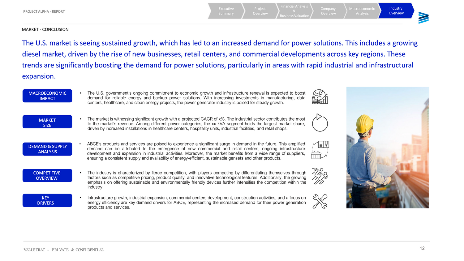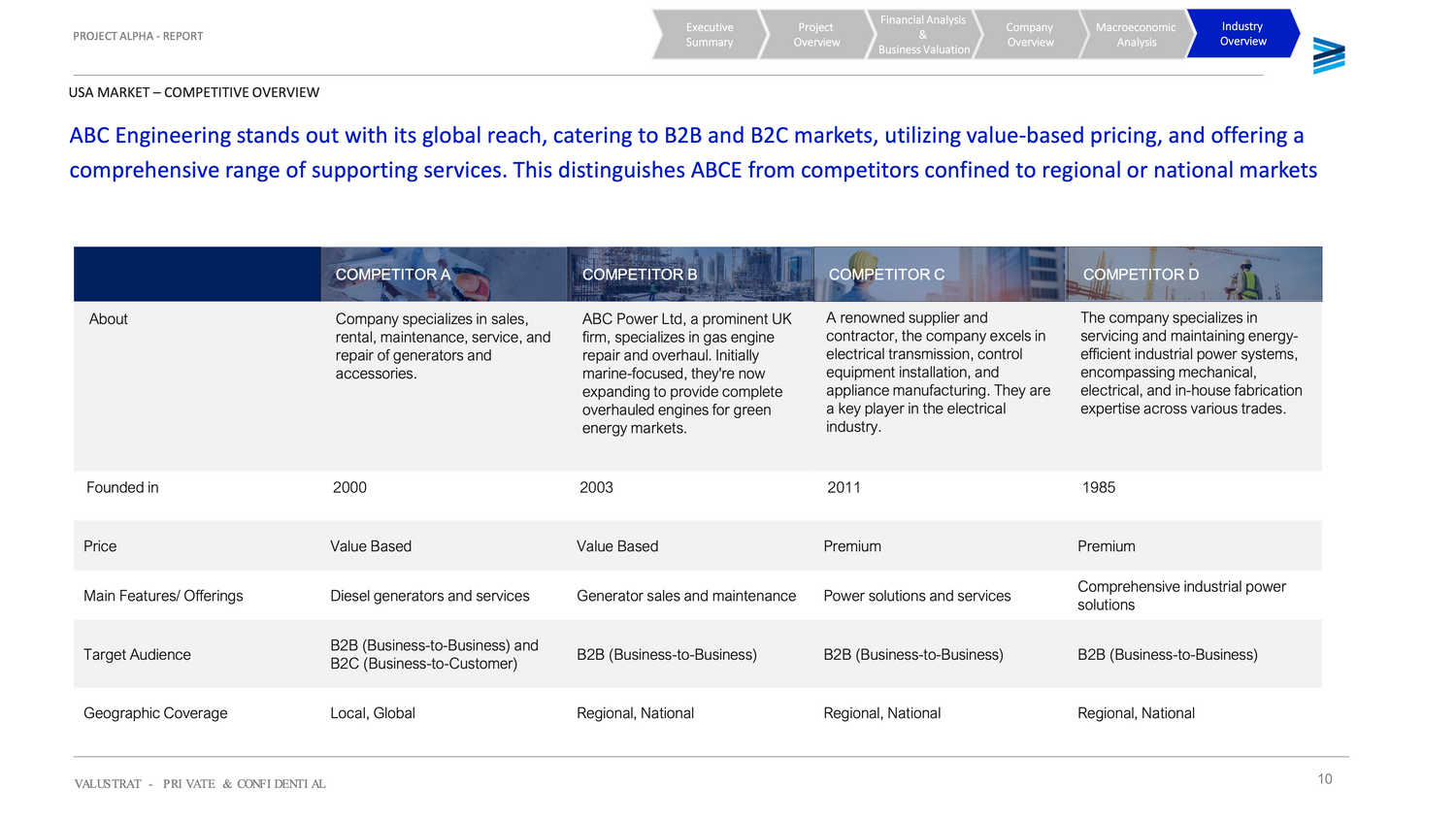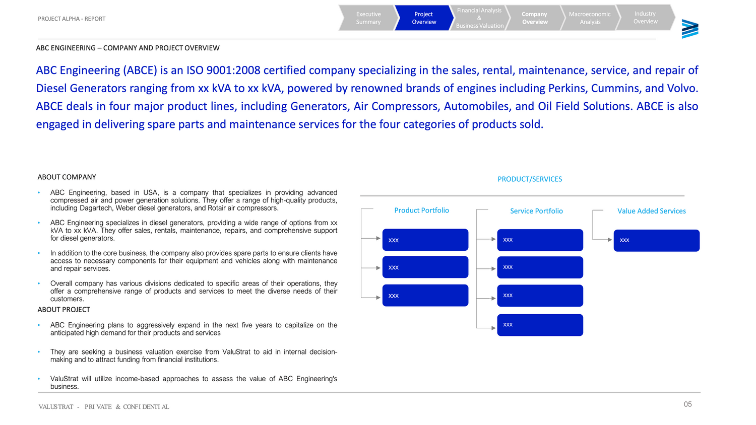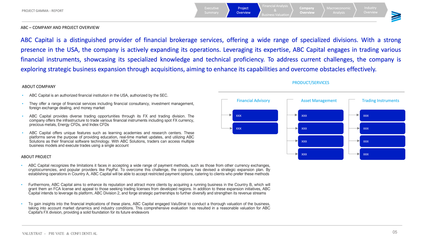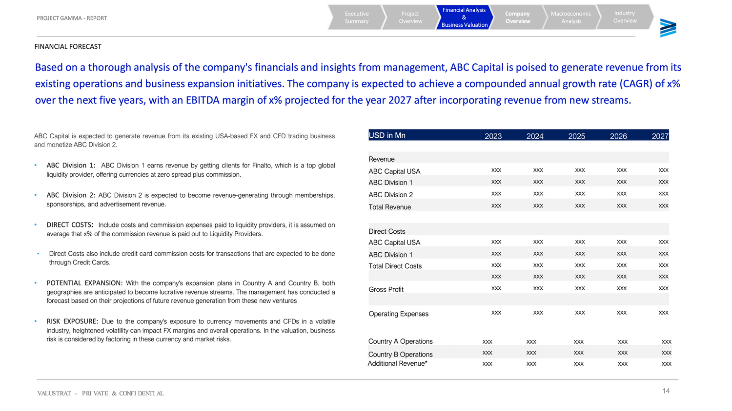 Within the business valuation section, we will employ established methodologies such as DCF (Discounted Cash Flow), comparable company analysis, and precedent transactions, meticulously tailored to the company's specifics. This will result in a presentation of valuation ranges, supported by visually presented sensitivity analyses, comprehensive ratio assessments, and insights into underlying growth assumptions.
