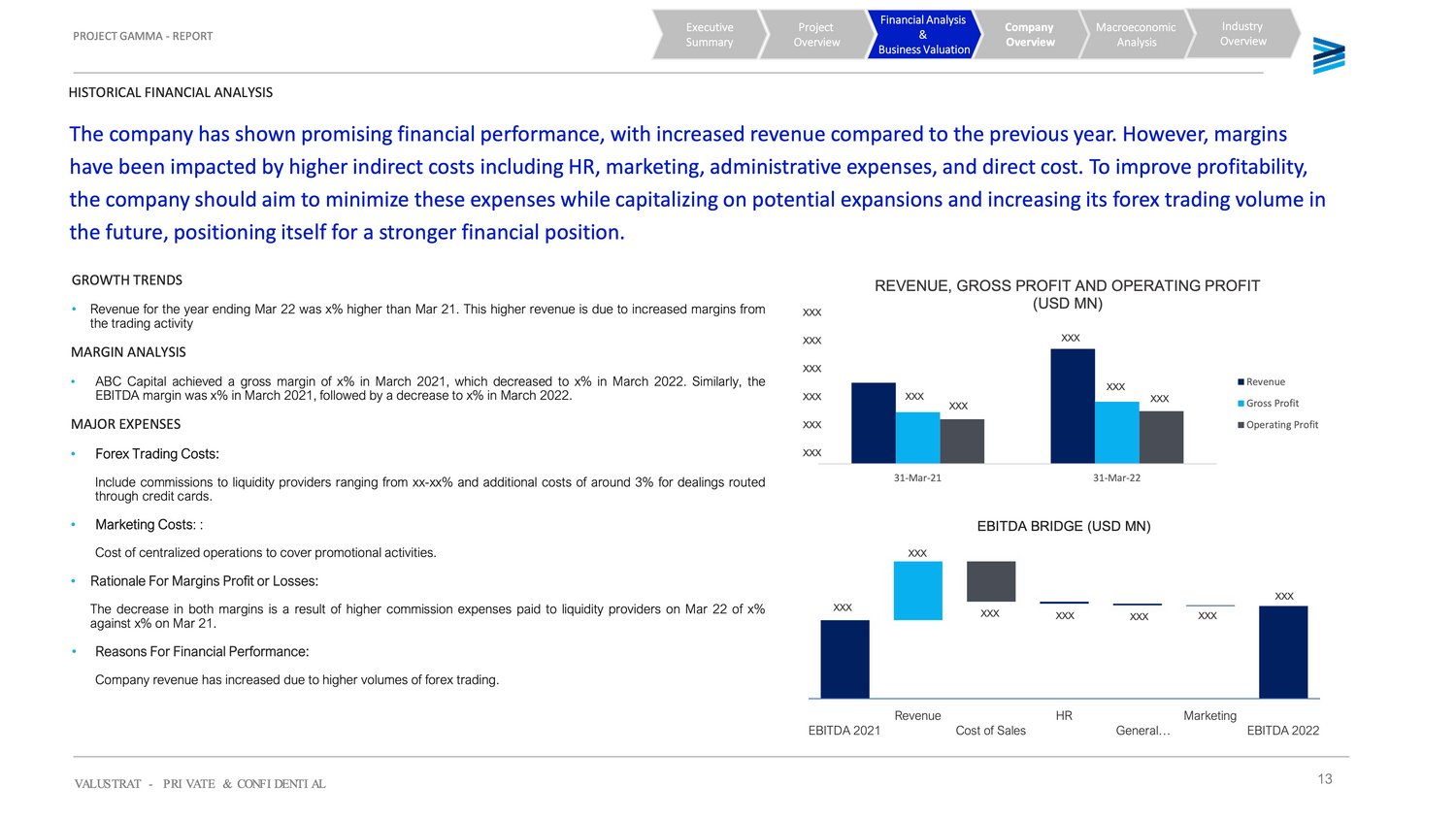 In the financial analysis section, a comprehensive evaluation will be conducted, encompassing a detailed review of historical financial performance, an in-depth analysis of growth catalysts, assessment of key operating metrics, projection forecasting, and the identification of pivotal value drivers.