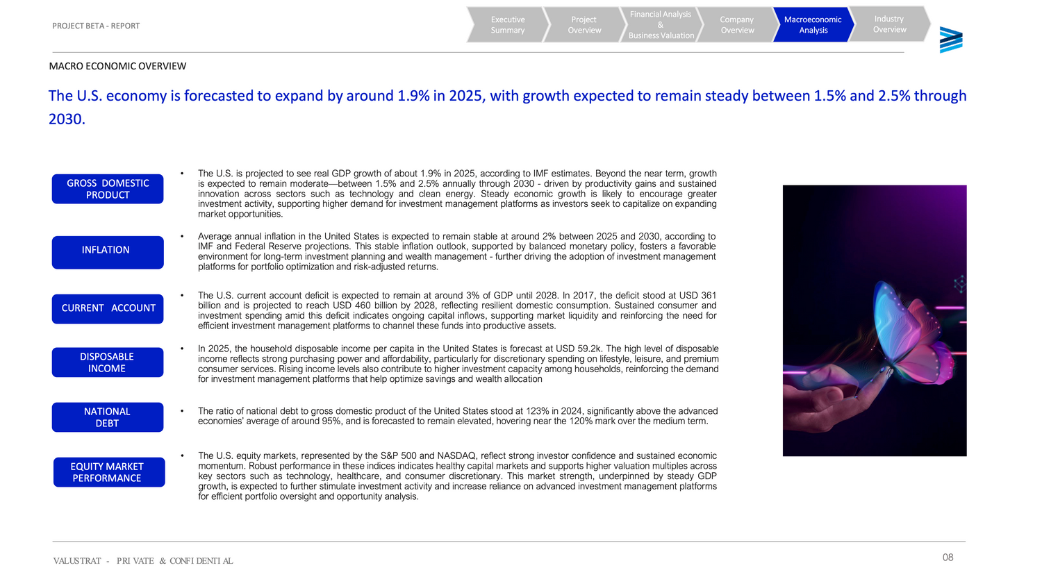 In the macroeconomic analysis section, we will conduct an assessment of crucial macroeconomic factors that impact valuation, including GDP growth, inflation, interest rates, fiscal policy, regulatory landscape, and other pertinent indicators specific to the company's industry and markets.
